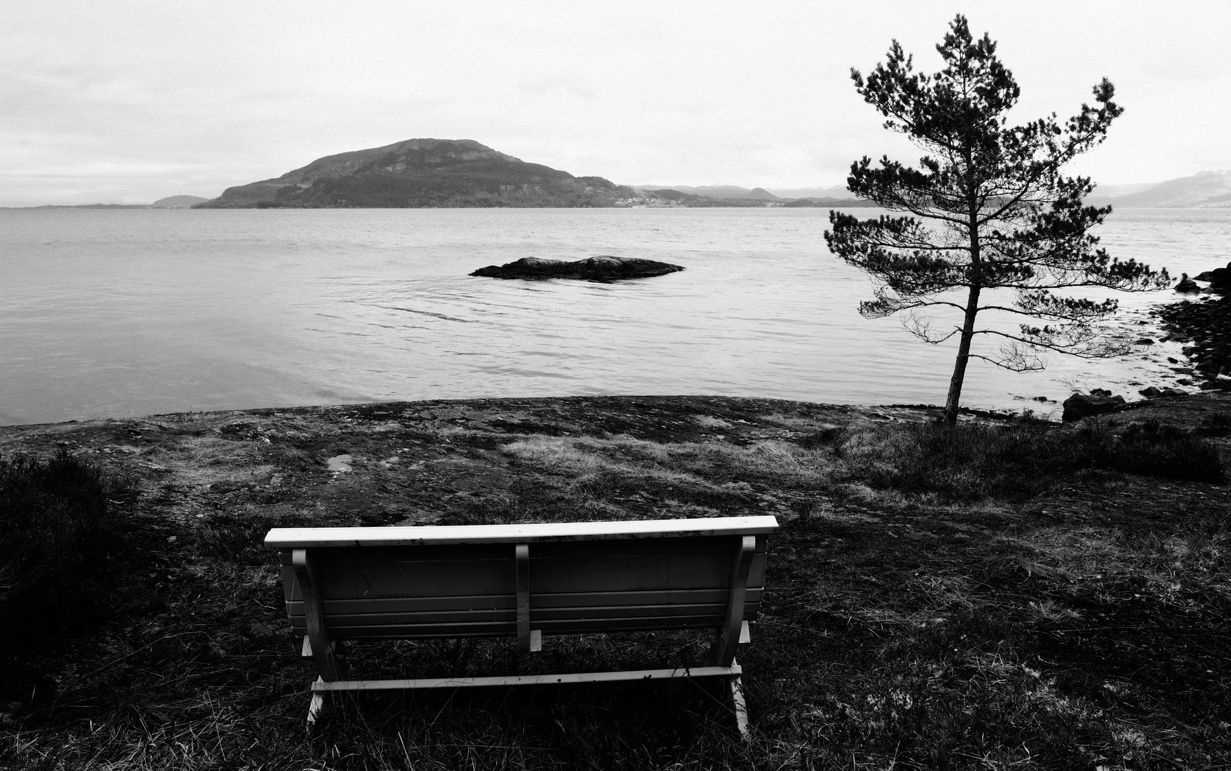 For eit par år sidan vart denne (grøne) benken satt ut med midlar frå Vindafjord kommune. Utsikta er nordover mot Borgundøy. Olympus PEN-F, M.Zuiko 17mm f/1,8